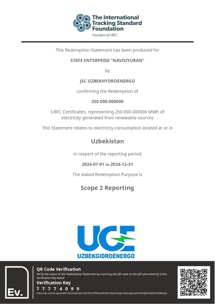 By acquiring these certificates, Navoiyuran demonstrates its commitment to environmental sustainability, contributes to the global fight against climate change, and strengthens its reputation in international markets.