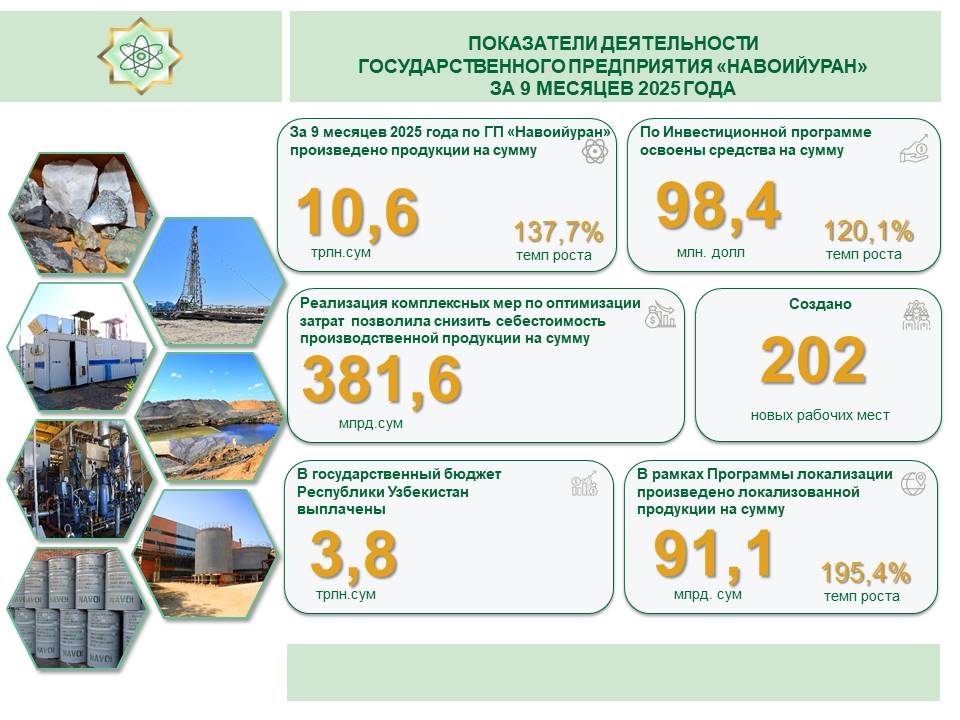 За 9 месяцев 2025 года по ГП «Навоийуран» произведено продукции на сумму 10,6 трлн сумов. Темп роста к аналогичному периоду 2024 года составил 137,7%. В Государственный бюджет Республики Узбекистан выплачено 3,8 трлн сумов налогов и дивидендов. По Инвестиционной программе освоены [...]