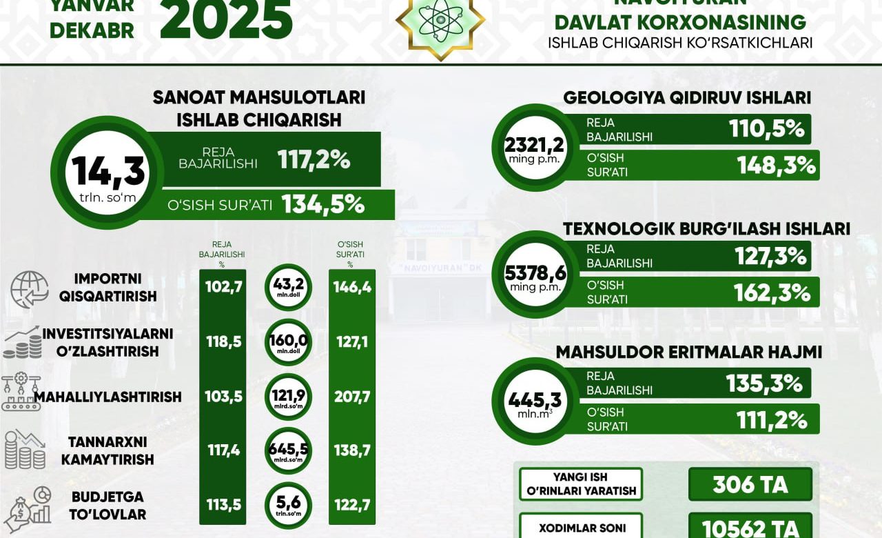 “Navoiyuran” davlat korxonasining 2025-yil yanvar-dekabr oylari faoliyatiga oid asosiy ko‘rsatkichlari