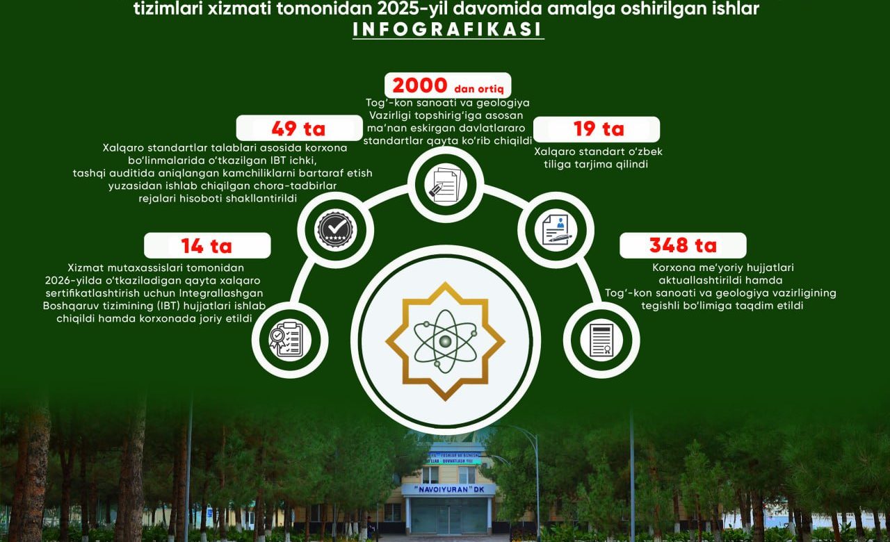 Yanvar 7, 2026Yanvar 7, 2026 Yangiliklar “Navoiyuran” davlat korxonasi Standartlashtirish, metrologiya, sertifikatlashtirish va sifat menejmenti tizimlari xizmati tomonidan 2025-yil davomida amalga oshirilgan ishlar infografikasi