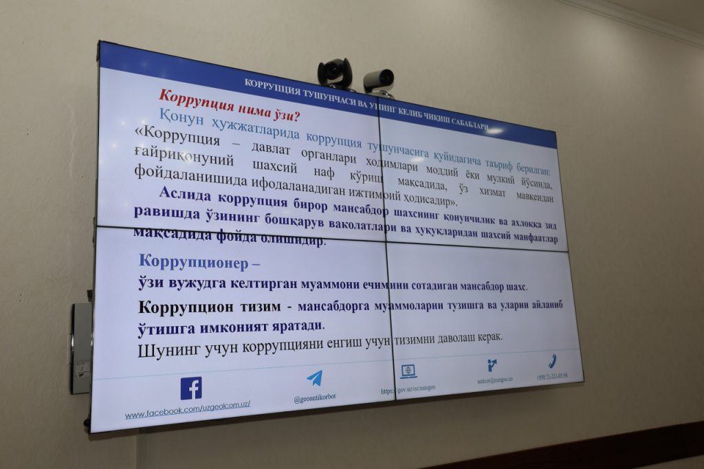 Korxona xodimlariga korrupsiya tushunchasi, ushbu sohani tartibga soluvchi qonunchilik va ichki hujjatlar, xalqaro standartlar, aniqlangan korrupsiya holatlari bo‘yicha javobgarlik choralari haqida batafsil ma’lumotlar berildi.